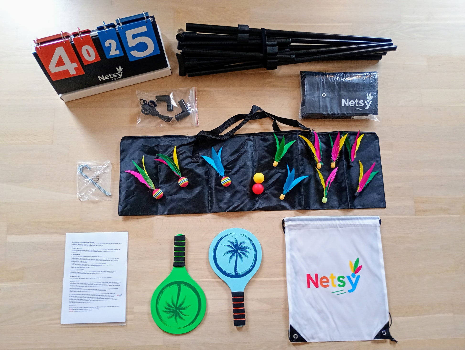 Nordic Batgame er inspireret af strandtennis, badminton, pickleball og bordtennis, og stadig en helt ny oplevelse. Med det originale spillesæt kan venner og familie være med til masser af sjove timer sammen. Der medfølger 2 lækre bats, 2 specielle gummi bolde og hele 10 fjerbolde, i en gearbag hertil. Samt det hvide danske design net, metalrammen, pointtavle, pløkker til vindsikring, dansk samlevejledning og de officielle spilleregler, så du har adgang til alle vores spil, og så spillesættet er helt komplet! Det hele opbevares forsvarligt og nemt i den medfølgende opbevarings og transporttaske der ligeledes medfølger. Se hele udstyrslisten nedenfor.